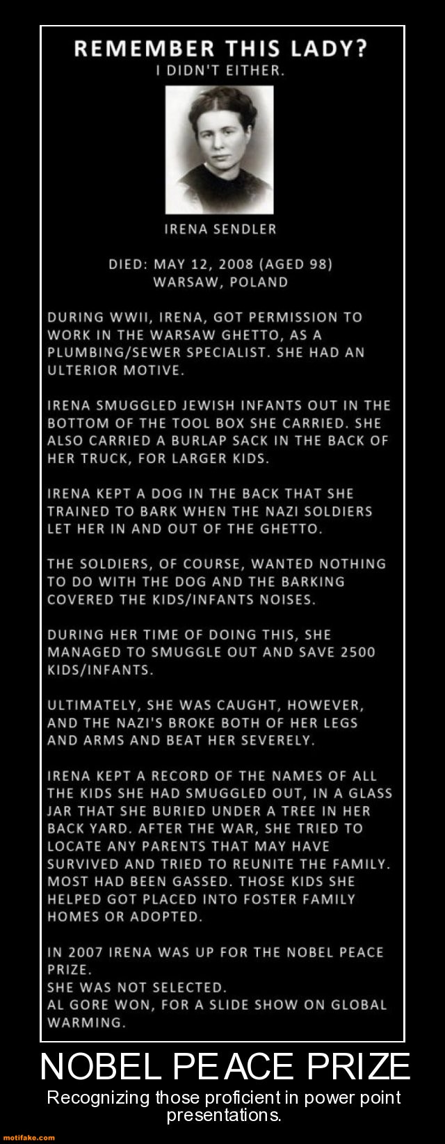 Irena Sendler Ronnie no comments August 6, 2013 Wikipedia: IRENA SENDLER Share this: Click to share on X (Opens in new window) X Click to share on Facebook (Opens in new window) Facebook Click to share on Pinterest (Opens in new window) Pinterest Click to share on Tumblr (Opens in new window) Tumblr Click to email a link to a friend (Opens in new window) Email Like Loading... Related