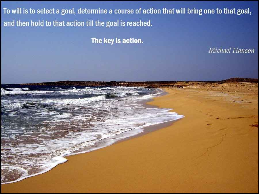 Goal Ronnie no comments April 10, 2014 To will is to select a goal, determine a course of action that will bring one to that goal, and then hold to that action till the goal is reached. The key is action. Michael Hanson Share this: Click to share on X (Opens in new window) X Click to share on Facebook (Opens in new window) Facebook Click to share on Pinterest (Opens in new window) Pinterest Click to share on Tumblr (Opens in new window) Tumblr Click to email a link to a friend (Opens in new window) Email Like Loading... Related