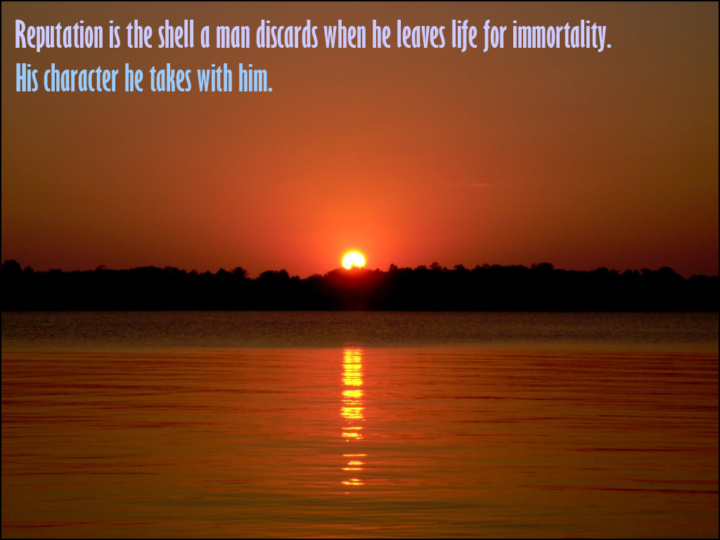 Reputation Ronnie no comments May 4, 2014 Reputation is the shell a man discards when he leaves life for immortality. His character he takes with him. Share this: Click to share on X (Opens in new window) X Click to share on Facebook (Opens in new window) Facebook Click to share on Pinterest (Opens in new window) Pinterest Click to share on Tumblr (Opens in new window) Tumblr Click to email a link to a friend (Opens in new window) Email Like Loading... Related
