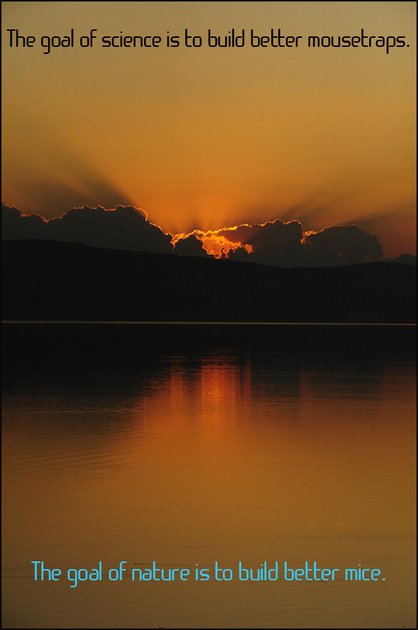 Goals Ronnie no comments July 20, 2014 The goal of science is to build better mousetraps. The goal of nature is to build better mice. Share this: Click to share on X (Opens in new window) X Click to share on Facebook (Opens in new window) Facebook Click to share on Pinterest (Opens in new window) Pinterest Click to share on Tumblr (Opens in new window) Tumblr Click to email a link to a friend (Opens in new window) Email Like Loading... Related