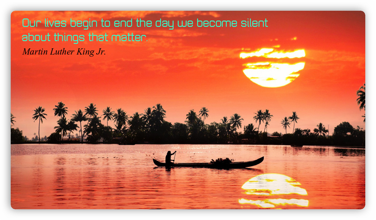 The Beginning Of The End Ronnie no comments August 17, 2014 Our lives begin to end the day we become silent about things that matter. Martin Luther King Jr. Share this: Click to share on X (Opens in new window) X Click to share on Facebook (Opens in new window) Facebook Click to share on Pinterest (Opens in new window) Pinterest Click to share on Tumblr (Opens in new window) Tumblr Click to email a link to a friend (Opens in new window) Email Like Loading... Related