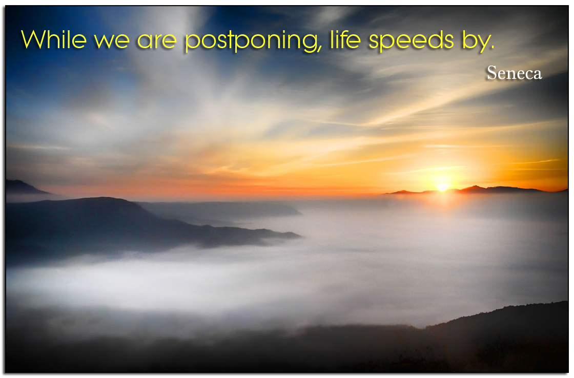 Postponing Ronnie 2 comments October 8, 2014 “While we are postponing, life speeds by.” Seneca Share this: Click to share on X (Opens in new window) X Click to share on Facebook (Opens in new window) Facebook Click to share on Pinterest (Opens in new window) Pinterest Click to share on Tumblr (Opens in new window) Tumblr Click to email a link to a friend (Opens in new window) Email Like Loading... Related