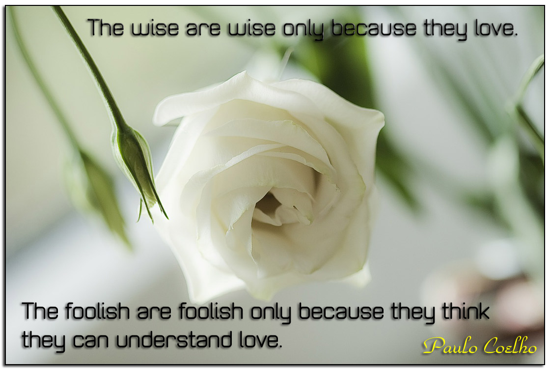 The Wise Ronnie 1 comment November 22, 2014 “The wise are wise only because they love. And the foolish are foolish only because they think they can understand love.” Paulo Coelho Share this: Click to share on X (Opens in new window) X Click to share on Facebook (Opens in new window) Facebook Click to share on Pinterest (Opens in new window) Pinterest Click to share on Tumblr (Opens in new window) Tumblr Click to email a link to a friend (Opens in new window) Email Like Loading... Related