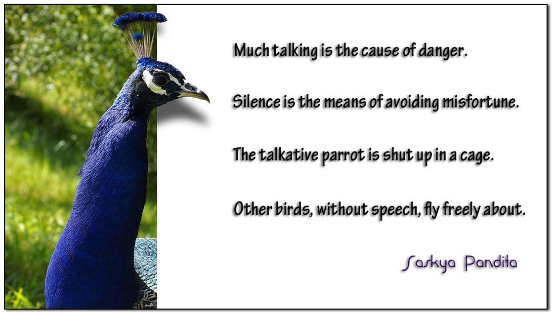“Much talking is the cause of danger. Silence is the means of avoiding misfortune. The talkative parrot is shut up in a cage. Other birds, without speech, fly freely about.”
