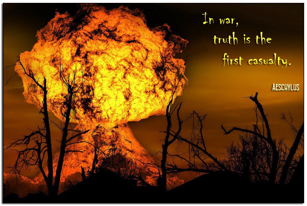 Truth Ronnie no comments January 4, 2015 “In war, truth is the first casualty.” Aeschylus Share this: Click to share on X (Opens in new window) X Click to share on Facebook (Opens in new window) Facebook Click to share on Pinterest (Opens in new window) Pinterest Click to share on Tumblr (Opens in new window) Tumblr Click to email a link to a friend (Opens in new window) Email Like Loading... Related