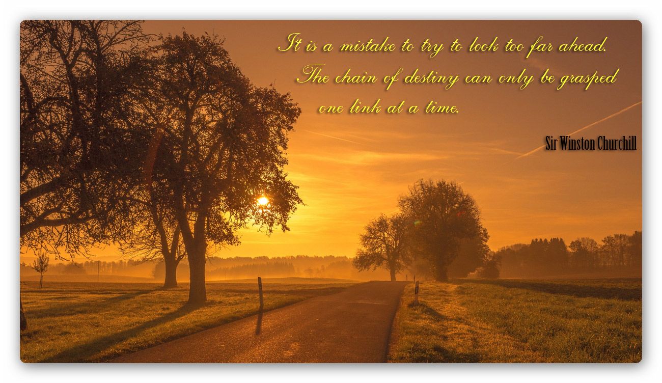 The Chain Of Destiny Ronnie no comments March 28, 2015 “It is a mistake to try to look too far ahead. The chain of destiny can only be grasped one link at a time.” Sir Winston Churchill Share this: Click to share on X (Opens in new window) X Click to share on Facebook (Opens in new window) Facebook Click to share on Pinterest (Opens in new window) Pinterest Click to share on Tumblr (Opens in new window) Tumblr Click to email a link to a friend (Opens in new window) Email Like Loading... Related