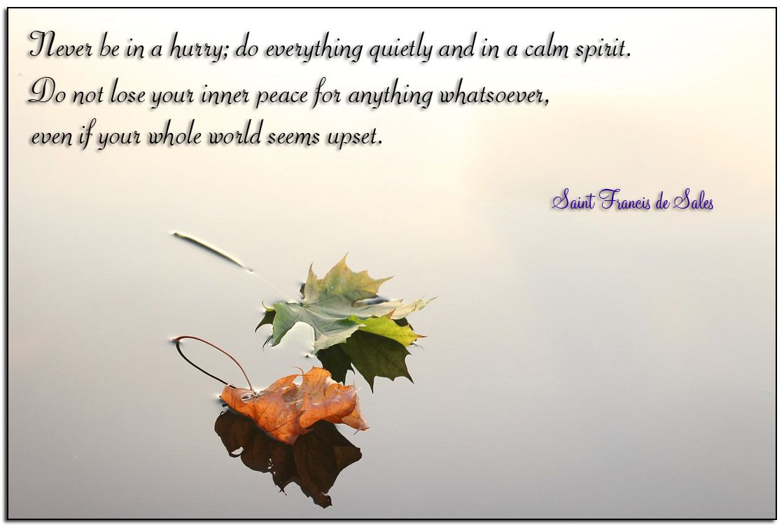 Calm Ronnie no comments April 15, 2015 “Never be in a hurry; do everything quietly and in a calm spirit. Do not lose your inner peace for anything whatsoever, even if your whole world seems upset.” Saint Francis de Sales Share this: Click to share on X (Opens in new window) X Click to share on Facebook (Opens in new window) Facebook Click to share on Pinterest (Opens in new window) Pinterest Click to share on Tumblr (Opens in new window) Tumblr Click to email a link to a friend (Opens in new window) Email Like Loading... Related