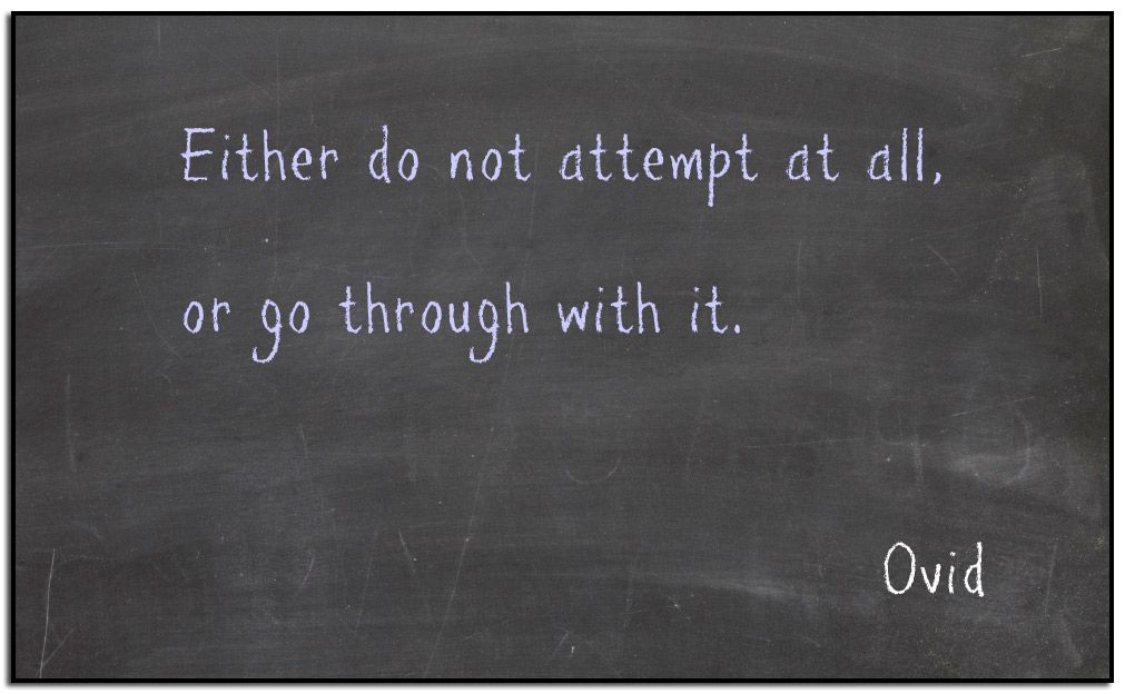 Attempt Ronnie no comments April 25, 2015 “Either do not attempt at all, or go through with it.” Ovid Share this: Click to share on X (Opens in new window) X Click to share on Facebook (Opens in new window) Facebook Click to share on Pinterest (Opens in new window) Pinterest Click to share on Tumblr (Opens in new window) Tumblr Click to email a link to a friend (Opens in new window) Email Like Loading... Related