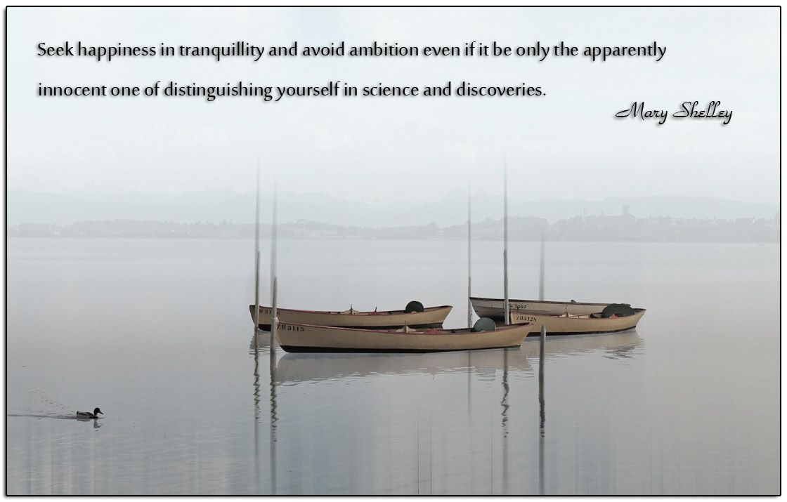 “Seek happiness in tranquillity and avoid ambition even if it be only the apparently innocent one of distinguishing yourself in science and discoveries.” Mary Shelley