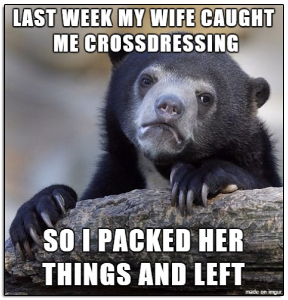Crossdressing Ronnie no comments July 4, 2015 Last week my wife caught me crossdressing So I packed her things and left Share this: Click to share on X (Opens in new window) X Click to share on Facebook (Opens in new window) Facebook Click to share on Pinterest (Opens in new window) Pinterest Click to share on Tumblr (Opens in new window) Tumblr Click to email a link to a friend (Opens in new window) Email Like Loading... Related