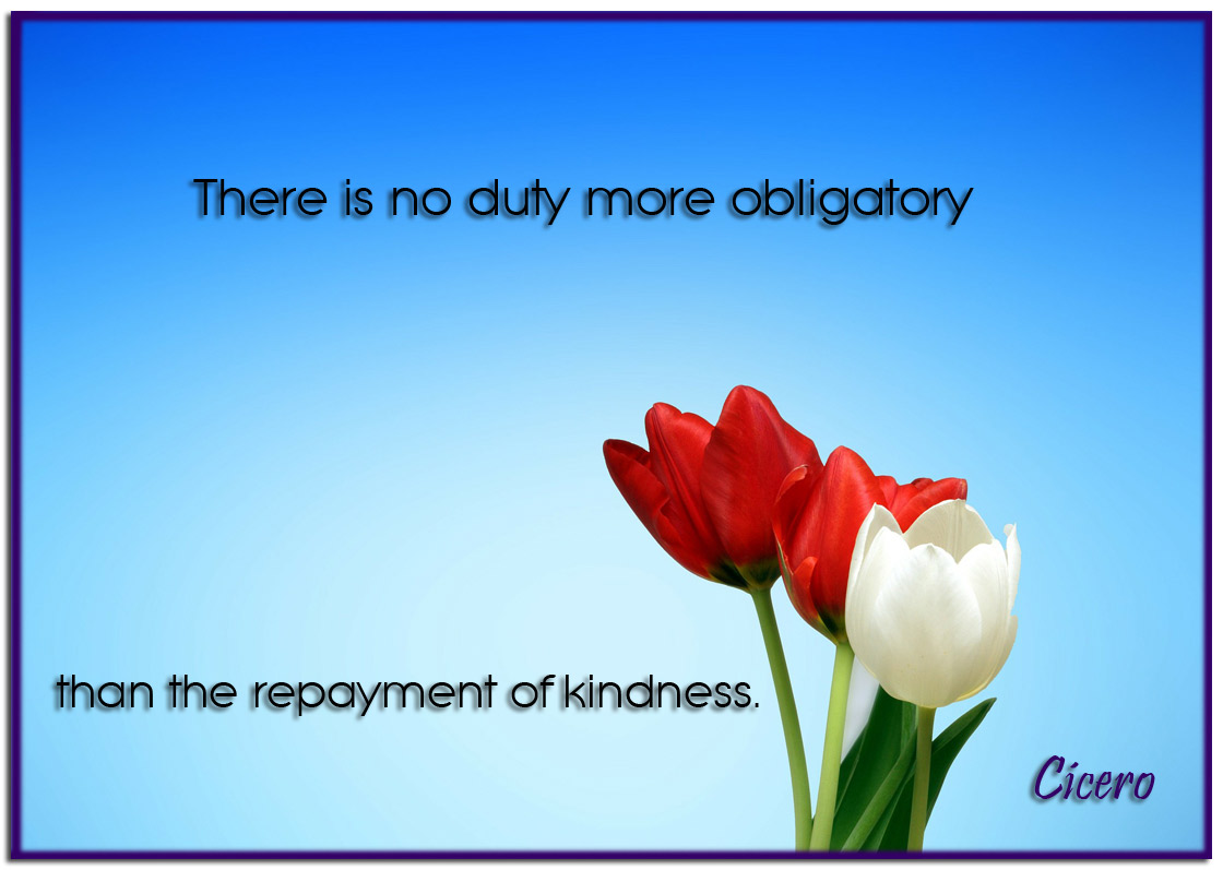 Obligatory Ronnie no comments July 13, 2015 “There is no duty more obligatory than the repayment of kindness.” Cicero Share this: Click to share on X (Opens in new window) X Click to share on Facebook (Opens in new window) Facebook Click to share on Pinterest (Opens in new window) Pinterest Click to share on Tumblr (Opens in new window) Tumblr Click to email a link to a friend (Opens in new window) Email Like Loading... Related