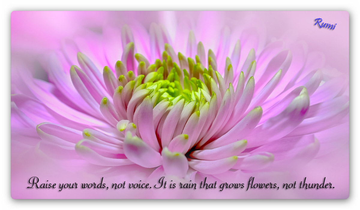 Raise Your Words Ronnie no comments November 1, 2015 “Raise your words, not voice. It is rain that grows flowers, not thunder.” Rumi Share this: Click to share on X (Opens in new window) X Click to share on Facebook (Opens in new window) Facebook Click to share on Pinterest (Opens in new window) Pinterest Click to share on Tumblr (Opens in new window) Tumblr Click to email a link to a friend (Opens in new window) Email Like Loading... Related