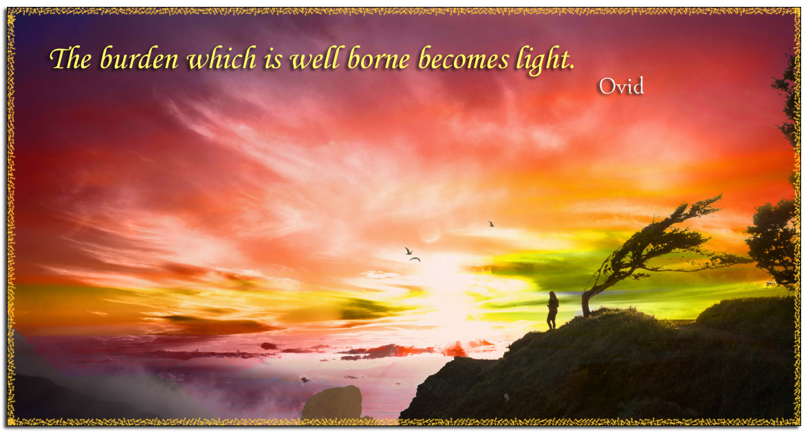 Burden Ronnie 2 comments January 17, 2016 “The burden which is well borne becomes light.” Ovid Share this: Click to share on X (Opens in new window) X Click to share on Facebook (Opens in new window) Facebook Click to share on Pinterest (Opens in new window) Pinterest Click to share on Tumblr (Opens in new window) Tumblr Click to email a link to a friend (Opens in new window) Email Like Loading... Related
