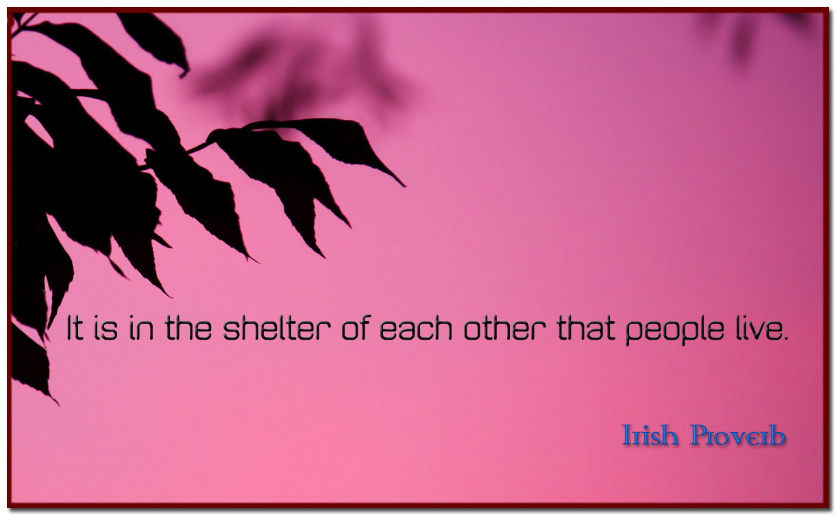 Shelter Ronnie no comments November 9, 2016 “It is in the shelter of each other that people live.” Irish Proverb Share this: Click to share on X (Opens in new window) X Click to share on Facebook (Opens in new window) Facebook Click to share on Pinterest (Opens in new window) Pinterest Click to share on Tumblr (Opens in new window) Tumblr Click to email a link to a friend (Opens in new window) Email Like Loading... Related