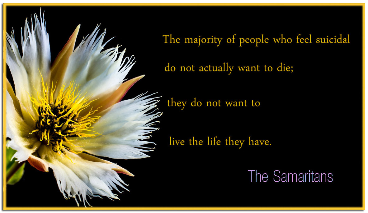 Suicidal People Ronnie no comments March 29, 2017 “The majority of people who feel suicidal do not actually want to die; they do not want to live the life they have.” The Samaritans Share this: Click to share on X (Opens in new window) X Click to share on Facebook (Opens in new window) Facebook Click to share on Pinterest (Opens in new window) Pinterest Click to share on Tumblr (Opens in new window) Tumblr Click to email a link to a friend (Opens in new window) Email Like Loading... Related