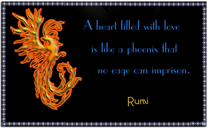 Phoenix Ronnie no comments March 30, 2017 “A heart filled with love is like a phoenix that no cage can imprison.” Rumi Share this: Click to share on X (Opens in new window) X Click to share on Facebook (Opens in new window) Facebook Click to share on Pinterest (Opens in new window) Pinterest Click to share on Tumblr (Opens in new window) Tumblr Click to email a link to a friend (Opens in new window) Email Like Loading... Related