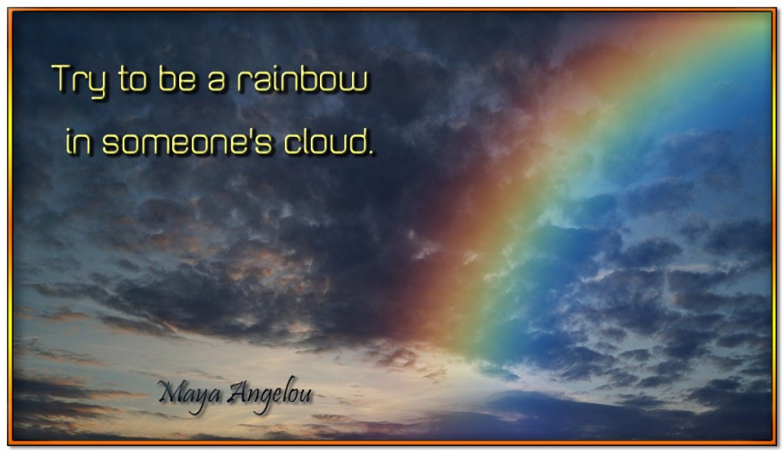 Rainbow Ronnie 2 comments April 1, 2017 “Try to be a rainbow in someone’s cloud.” Maya Angelou Share this: Click to share on X (Opens in new window) X Click to share on Facebook (Opens in new window) Facebook Click to share on Pinterest (Opens in new window) Pinterest Click to share on Tumblr (Opens in new window) Tumblr Click to email a link to a friend (Opens in new window) Email Like Loading... Related