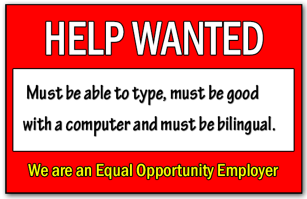 A local business was looking for office help and put up sign stating the following: “HELP WANTED. Must be able to type, must be good with a computer and must be bilingual. We are an Equal Opportunity Employer.”