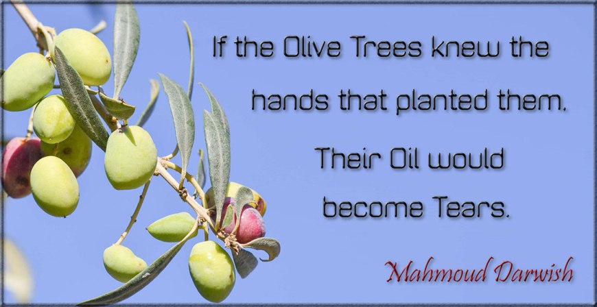 Olive Trees Ronnie no comments May 15, 2022 If the Olive Trees knew the hands that planted them, Their Oil would become Tears. Mahmoud Darwish Share this: Click to share on X (Opens in new window) X Click to share on Facebook (Opens in new window) Facebook Click to share on Pinterest (Opens in new window) Pinterest Click to share on Tumblr (Opens in new window) Tumblr Click to email a link to a friend (Opens in new window) Email Like Loading... Related