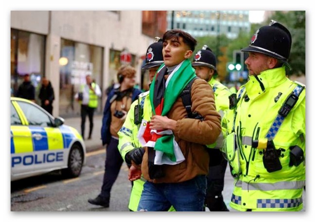 A man was arrested in Manchester, England for “displaying the Palestinian flag“. It was folded around his neck. This follows a letter sent out to the Chief Constables of England and Wales, from the Home Secretary, Suella Braverman, stating, among other points, that: