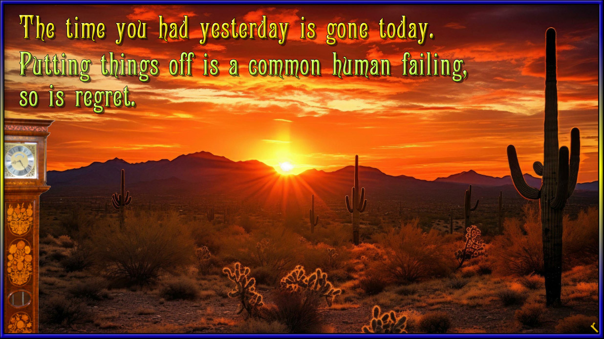 Time Ronnie no comments May 13, 2025 The time you had yesterday is gone today. Putting things off is a common human failing, so is regret. Share this: Click to share on X (Opens in new window) X Click to share on Facebook (Opens in new window) Facebook Click to share on Pinterest (Opens in new window) Pinterest Click to share on Tumblr (Opens in new window) Tumblr Click to email a link to a friend (Opens in new window) Email Like Loading... Related