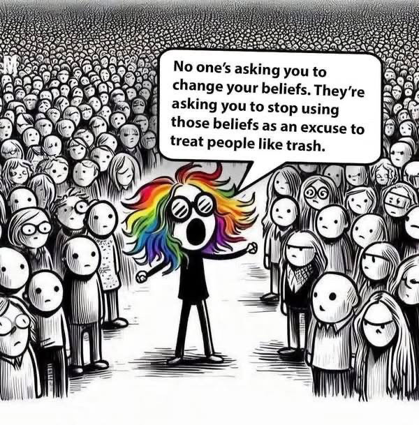Beliefs Ronnie no comments May 24, 2025 I saw this image on Bluesky. It sums up a lot of people, and is worth sharing in my opinion. No one’s asking you to change your beliefs. they’re asking you to stop using those beliefs as an excuse to treat people like trash. Share this: Click to share on X (Opens in new window) X Click to share on Facebook (Opens in new window) Facebook Click to share on Pinterest (Opens in new window) Pinterest Click to share on Tumblr (Opens in new window) Tumblr Click to email a link to a friend (Opens in new window) Email Like Loading... Related